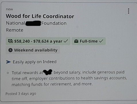 I’ve not included the entire job posting here, but I’ll mention that the salary range posted doesn’t mention bonuses earned – which IS a part of the total compensation package. (Pardon the pun.) My sources tell me that this position opens up every couple of months, sometimes even faster than that. Why? The “Wood for Life” concept is such a big hit worldwide that the bonuses earned by the coordinator can be in the millions of dollars! Which, if you have an imagination such as mine, you’d fully expect...